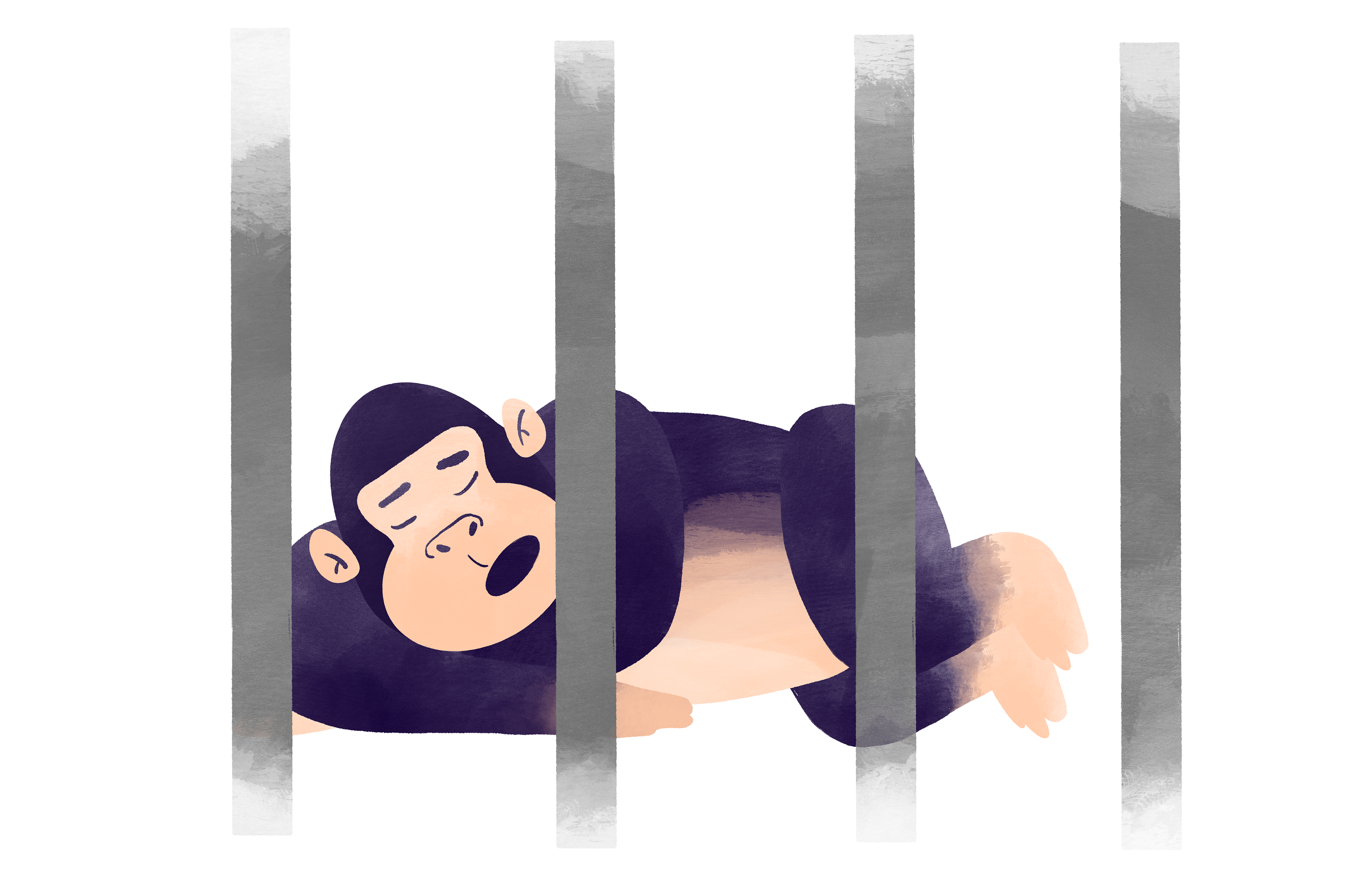 A is for ape. In the zoo, Matilda sleeps behind a big iron gate.